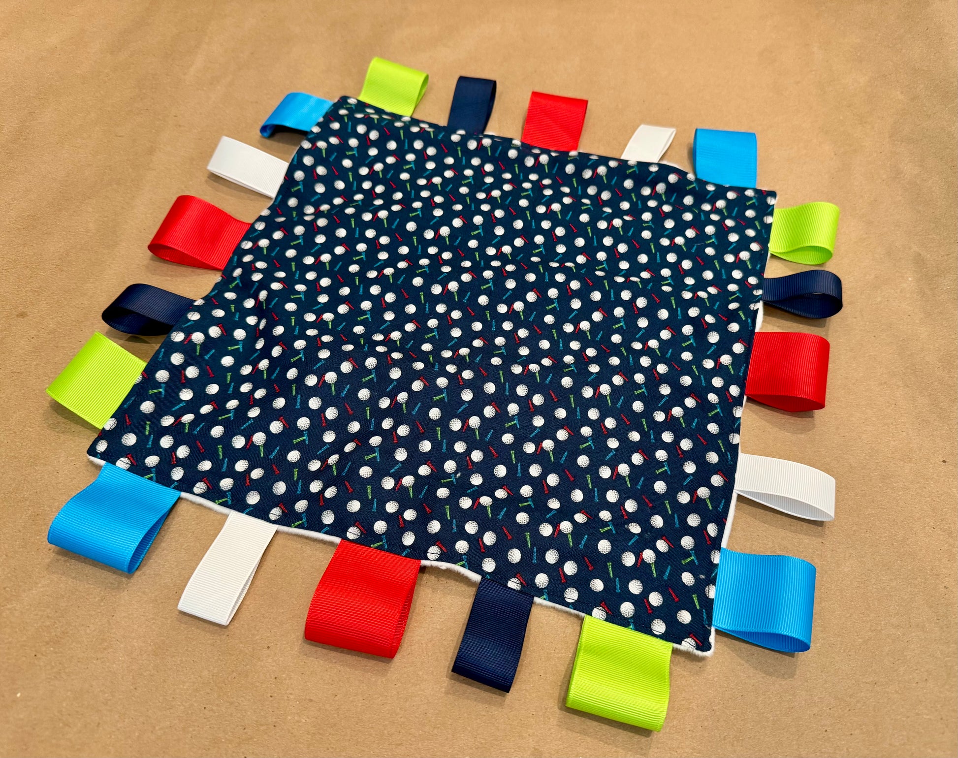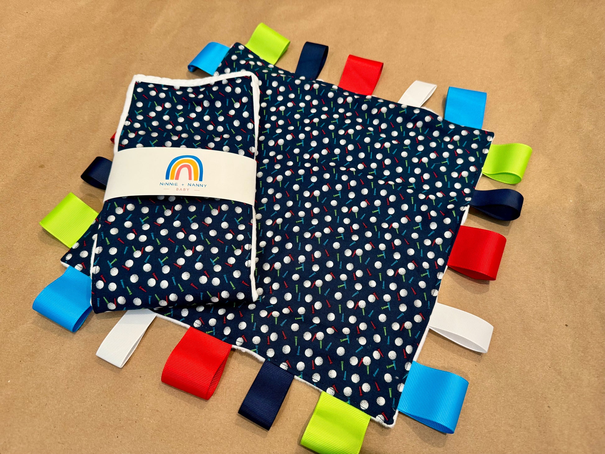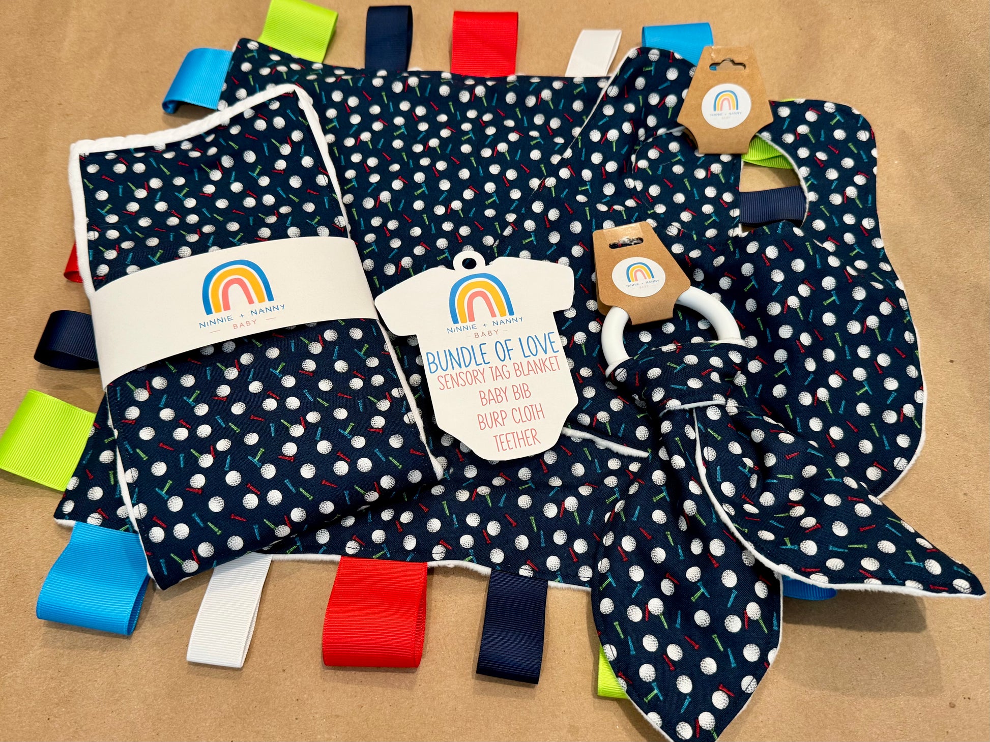 Make gift-giving a breeze with the "Bundle of Love - Fore - Golf" baby gift set! This adorable collection includes a baby bib, burp cloth, sensory tag blanket, and teether—all in charming coordinating prints.