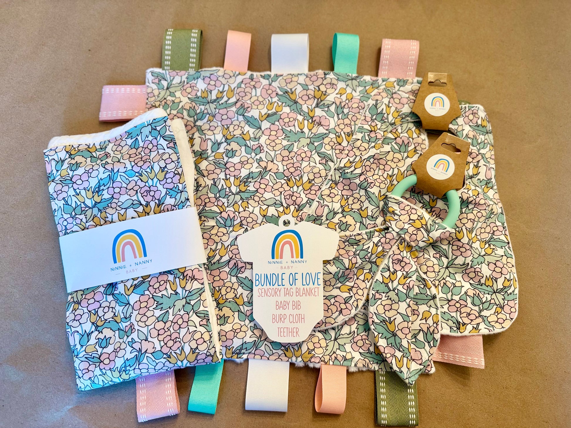 Make gift-giving a breeze with the "Bundle of Love - Josie - Sweet Floral" baby gift set! This adorable collection includes a baby bib, burp cloth, sensory tag blanket, and teether—all in charming coordinating prints.