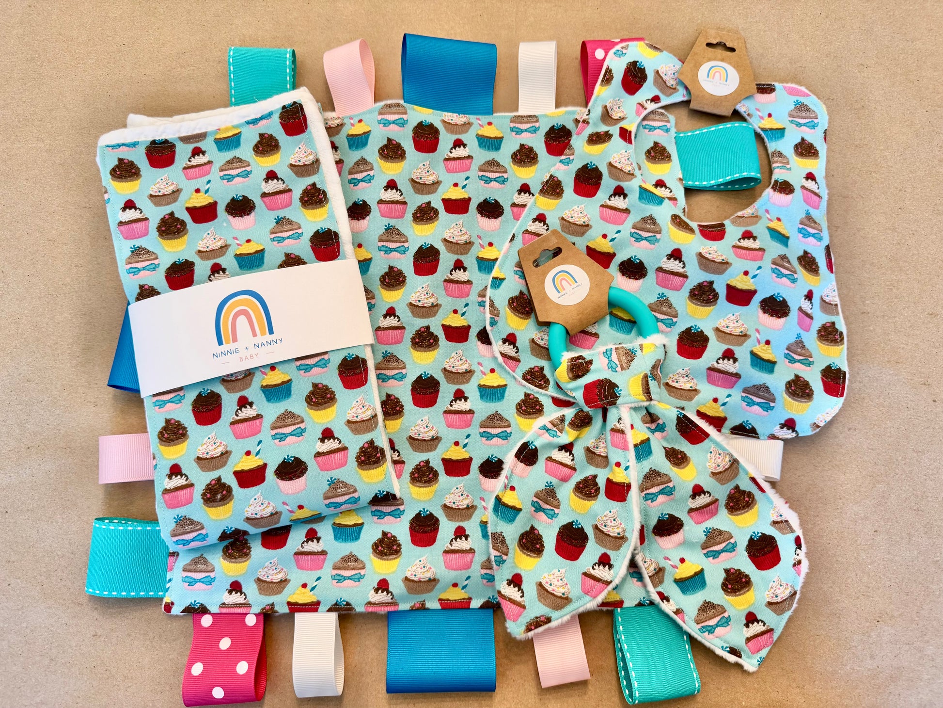 Make gift-giving a breeze with the "Bundle of Love - Little Cupcake" baby gift set! This adorable collection includes a baby bib, burp cloth, sensory tag blanket, and teether—all in charming coordinating prints. The bright, colorful print features lots of yummy cupcakes on a bright teal background.