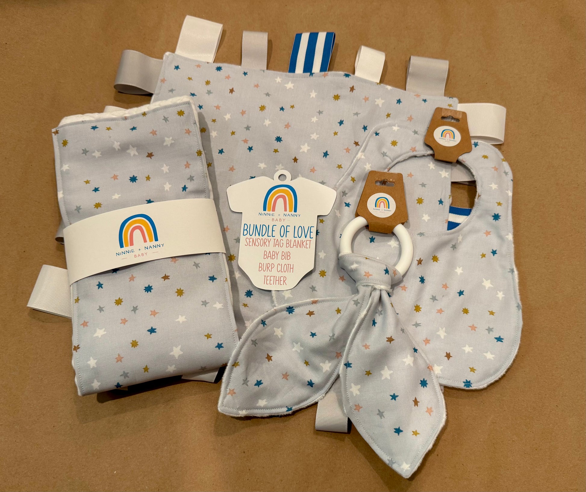 Make gift-giving a breeze with the "Bundle of Love - Oh My Stars" baby gift set! This adorable collection includes a baby bib, burp cloth, sensory tag blanket, and teether—all in charming coordinating prints.