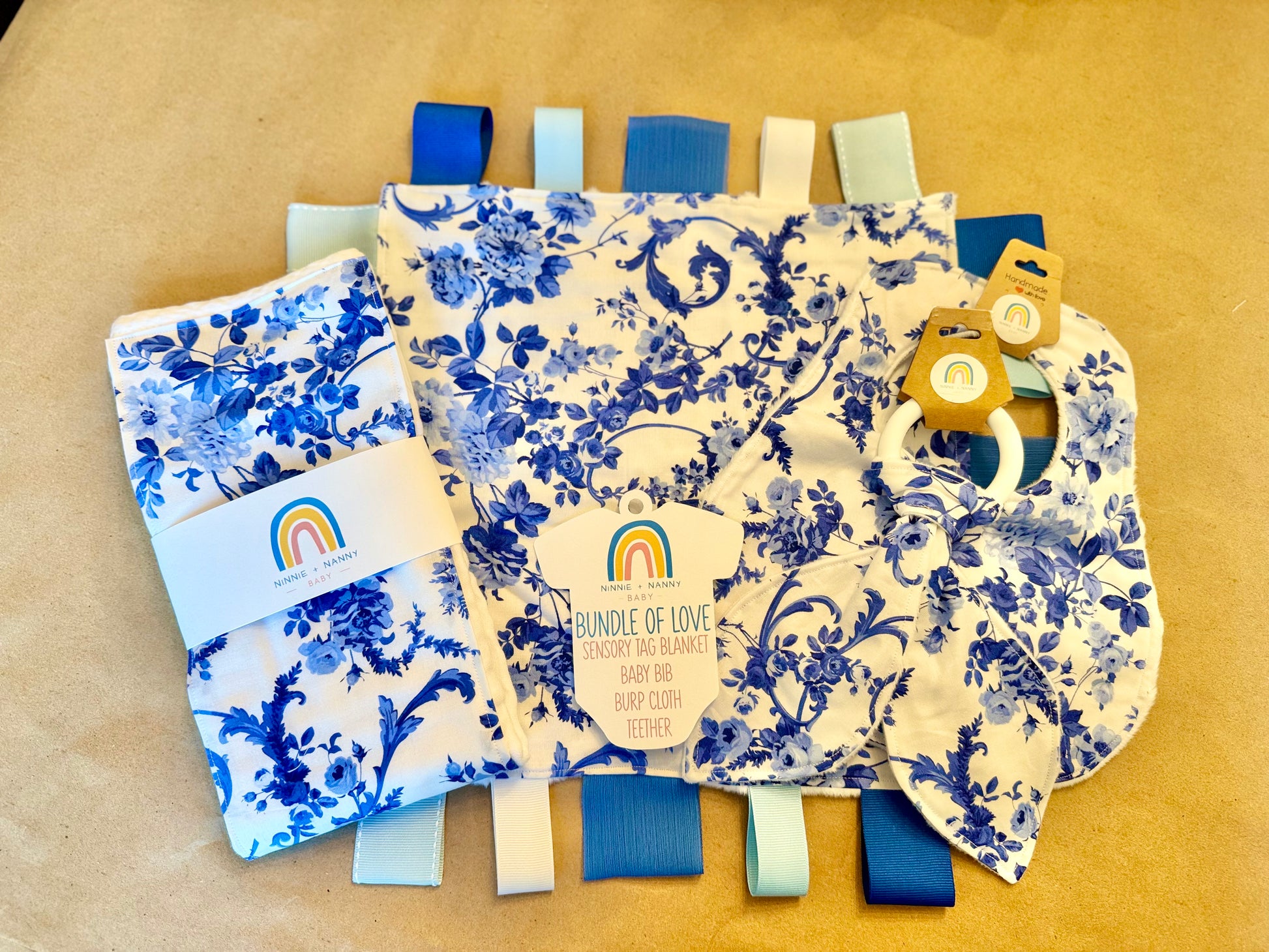 Make gift-giving a breeze with the "Bundle of Love - Sorority Blues" baby gift set! This adorable collection includes a baby bib, burp cloth, sensory tag blanket, and teether—all in charming coordinating prints.