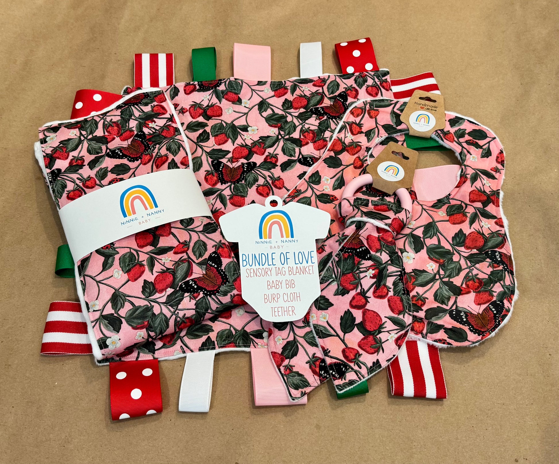 Make gift-giving a breeze with the "Bundle of Love - Strawberry Fields" baby gift set! This adorable collection includes a baby bib, burp cloth, sensory tag blanket, and teether—all in charming coordinating prints. The sweetest little strawberries on vines with flowers + butterflies make for the girliest of girly baby gifts.