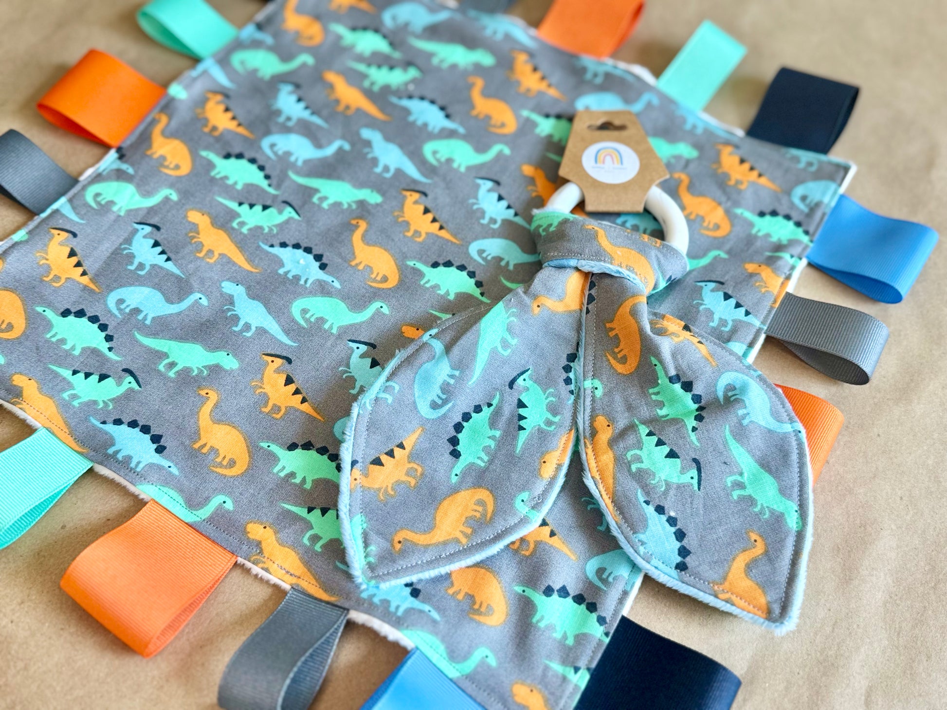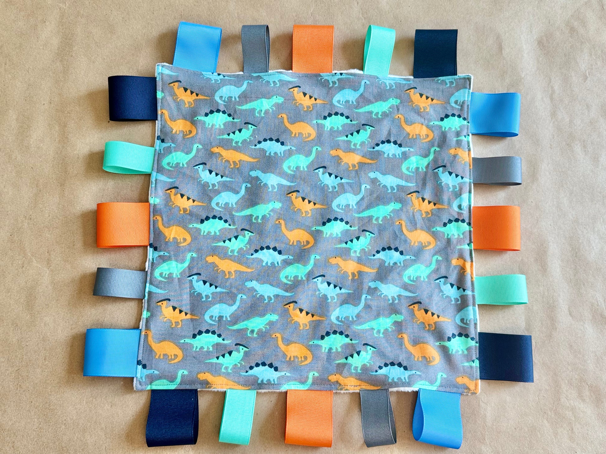 Entertain your little one with a sensory tag blanket that provides both tactile and visual stimulation. They can snuggle up with this cozy security blanket while playing with the ribbon tag loops. Our blankets comfort and settle your baby while helping them develop fine motor skills. A must-have for any new mom! Made with premium cotton, soft minki dot backing, and coordinating ribbon "tag" loops. Choose from a variety of cute, playful patterns, themes, and prints - perfect for home, car, and stroller. Sensory Tag Blankets measure at approximately 12" x 12".